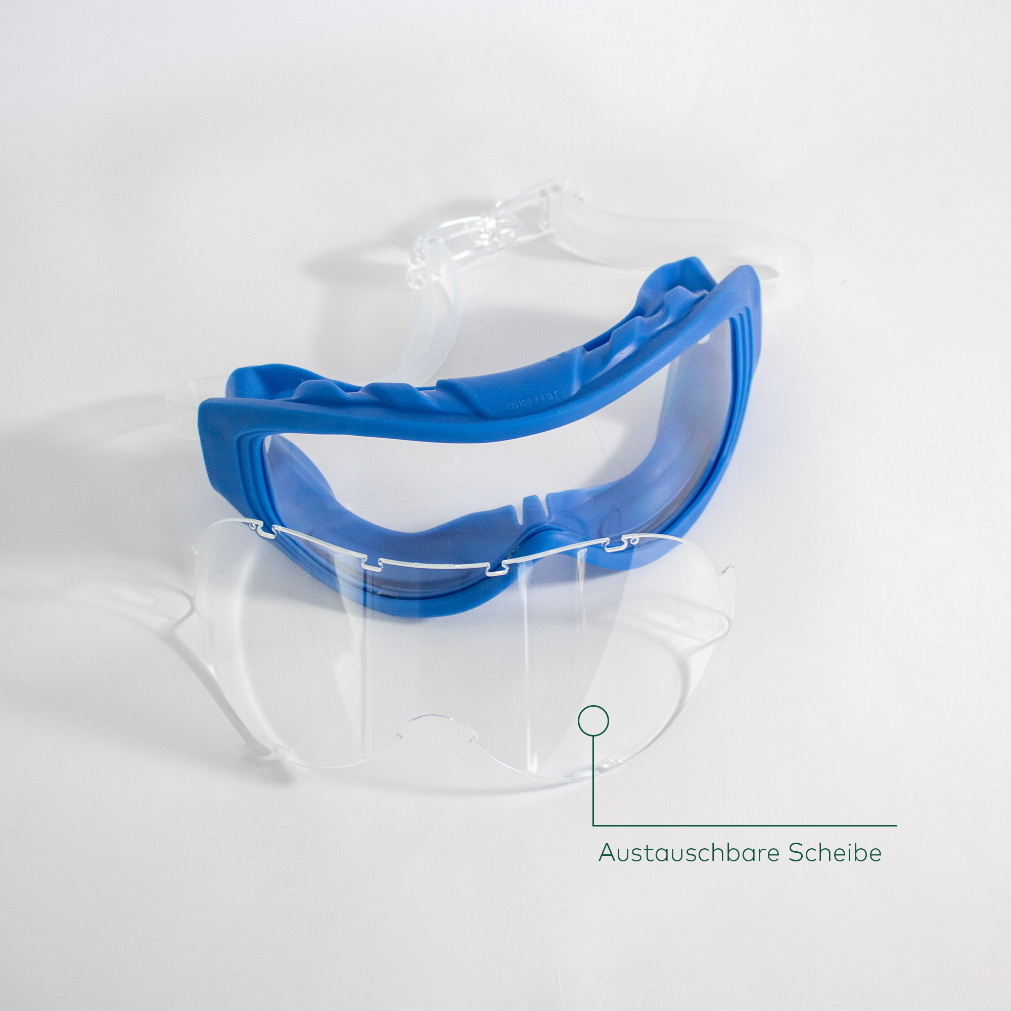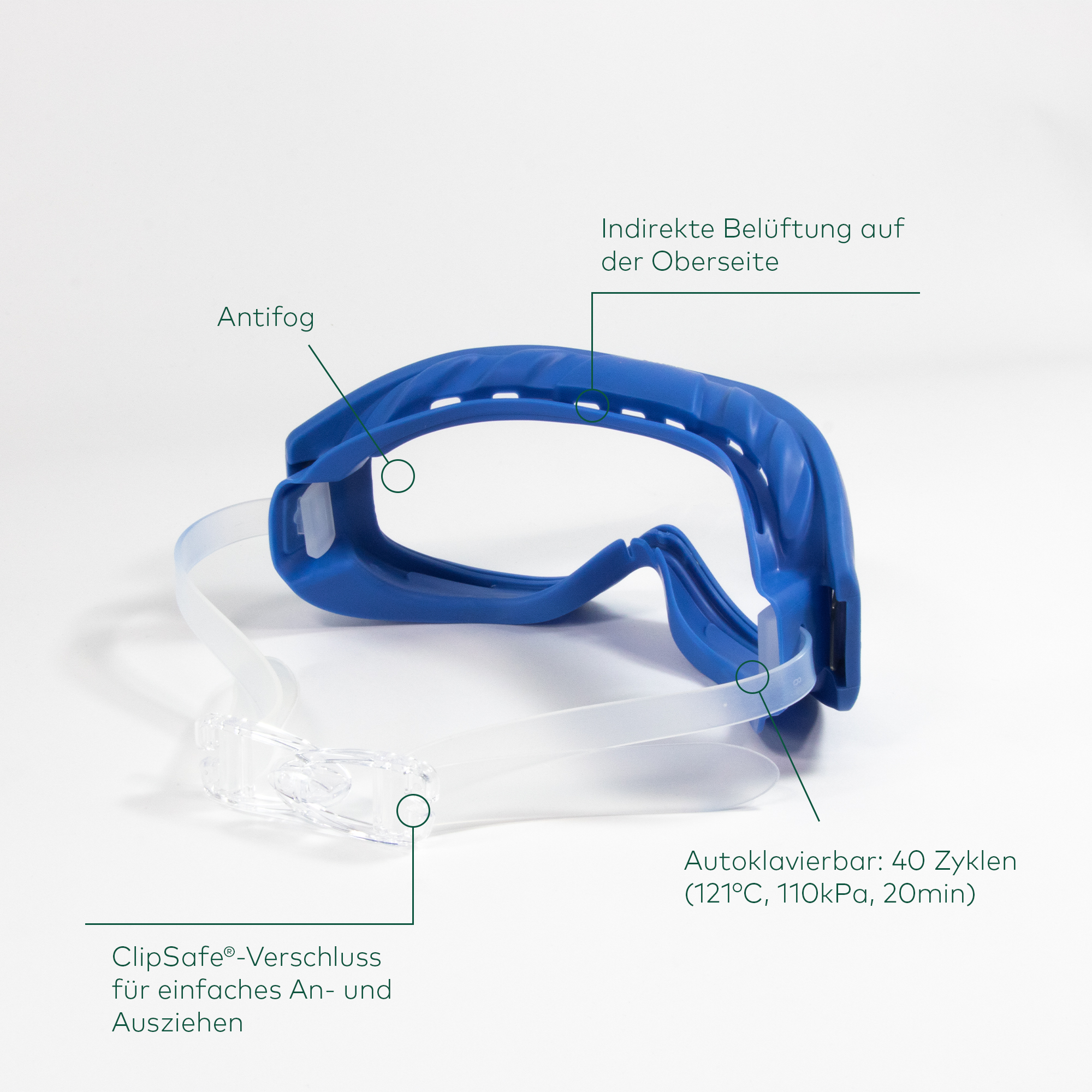 Among other uses, it is also used in aseptic conditions, including but not limited to the chemical, pharmaceutical, electronic industries or hospital laboratories. These goggles are designed to withstand multiple sterilisation in an autoclave without any noticeable changes. The careful design allows for long service life and maximum transpiration, offering a wide field of vision and use over all prescription eyewear.